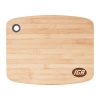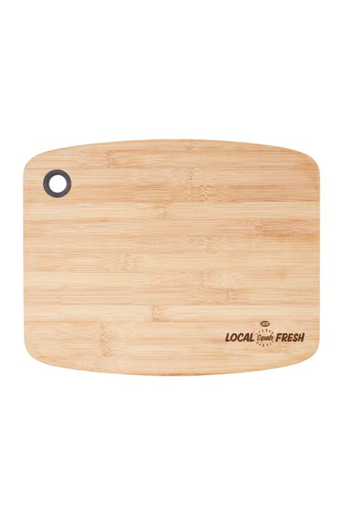 The natural color bamboo cutting board features a thumb hole with silicone ring for ease of handling and provides a perfect location to hang the cutting board when not being used. Its slim profile design makes it easy to store in a drawer or where space is at a premium. Cutting board measures 15″ x 12″ x .6″. Due to the nature of the bamboo material, variations in laser imprinting quality may occur.