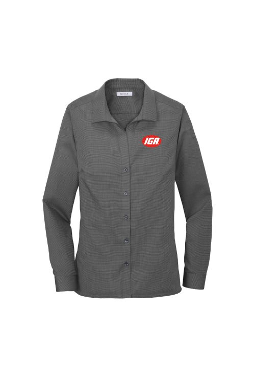 Thoroughly updated, this crisp nailhead shirt has a silky feel and a wrinkle-resistant finish for exceptional non-iron performance. 4-ounce, 60/40 cotton/polyester with pucker-free taped seams, RH engraved buttons to elevate the office-ready look. Open collar and neckline, bust darts and back seaming. Mitered adjustable cuffs.